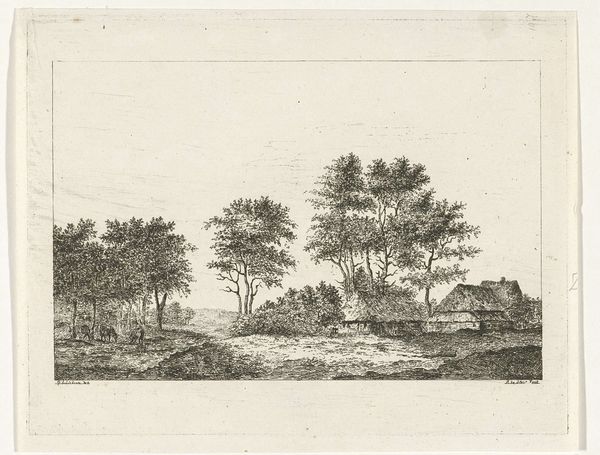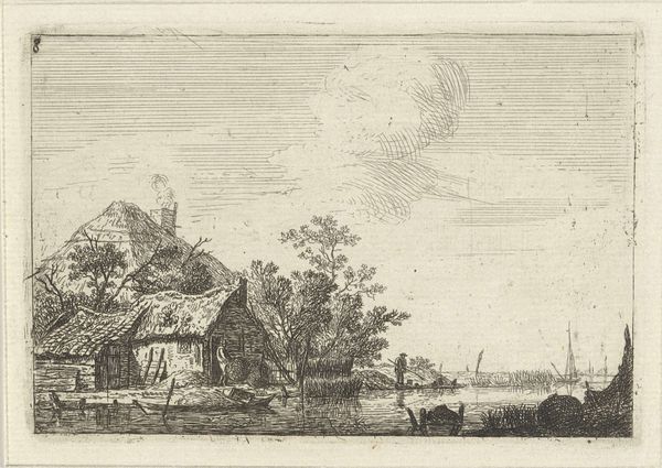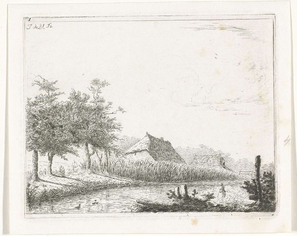 Hendrik Schwegman made this small etching of a farm by the water during the late eighteenth century. The almost monochromatic scene invites us to observe its play of light and shadow, carefully rendered through the density and direction of the etched lines. The composition divides roughly into three horizontal bands. The foreground is dominated by dense vegetation, depicted with short, energetic strokes that suggest texture and depth. Above, the farmhouse emerges, its structure defined by more regular, parallel lines. This creates a contrast between the natural, organic forms and the constructed environment. The sky, rendered with sparse, horizontal lines, creates a sense of openness. Consider how Schwegman uses line to not only depict objects but also to evoke atmosphere. The overall effect is one of tranquility, inviting contemplation on the relationship between humanity and nature. Meaning is not fixed, but rather emerges through the ongoing interaction between the viewer and the artwork's formal qualities.