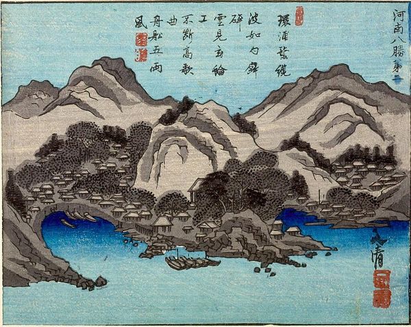 Editor: Here we have Hiroshige's woodblock print, "No. 48, Sakanoshita," part of his *Fifty-three Stations of the Tōkaidō* series. The imposing mountain dominates the scene, but I'm curious about the title referring to an artist throwing away his brush. What's the story behind this place? Curator: It suggests a rejection of traditional artistic constraints. Consider the social and political context of the Edo period. Was this "old master" perhaps challenging the artistic establishment, or grappling with the limitations imposed upon them? The very act of discarding the brush becomes a powerful statement. Editor: So the mountain itself becomes a symbol of artistic liberation? Curator: Precisely! How does that reading resonate with you given what you know of contemporary attitudes toward authority? Perhaps this print isn't just about a specific location, but a timeless struggle for artistic freedom. Editor: That reframes how I see it completely. I’ll definitely remember that!