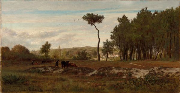 Narcisse-Virgilio Diaz painted "Path Near the Pond of Vipers, Fontainebleau Forest" using oil on canvas, presenting a landscape imbued with a somber yet captivating presence. The composition is structured by a pathway that recedes into the distance, flanked by trees and foliage rendered with a keen sense of texture. Diaz employs a rich palette of browns, greens, and grays to evoke the forest's atmosphere. The brushwork is loose and expressive, especially in the rendering of the sky, where dark clouds gather, suggesting an impending storm. The interplay of light and shadow animates the scene, creating depth and visual interest. The painting destabilizes traditional landscape conventions by focusing on the untamed aspects of nature, rather than idealized views. Diaz’s emphasis on materiality and texture—through his dynamic brushstrokes—invites the viewer to contemplate the raw, unfiltered beauty of the Fontainebleau forest. This focus shifts the aesthetic experience from mere representation to a deeper engagement with the sensory qualities of the natural world.
