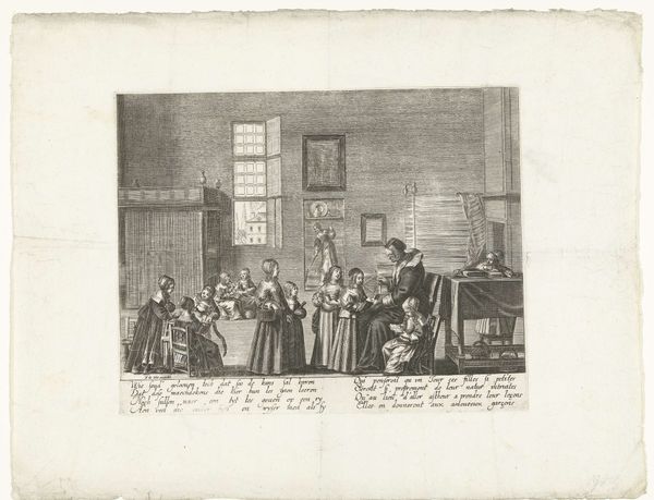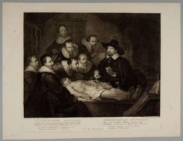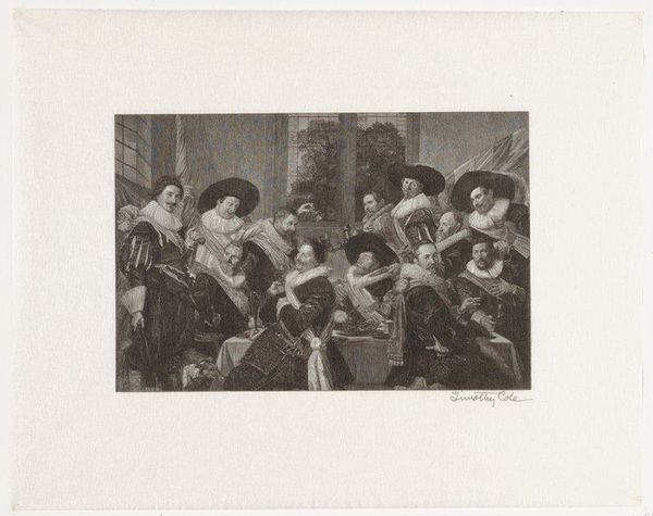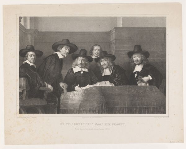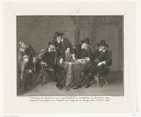 Curator: Let's discuss "Snydics de la halle aux draps" by Jan Pieter de Frey, currently residing at the Harvard Art Museums. Editor: It's quite striking—that long table dominates the composition, doesn't it? Almost a barrier separating us from those serious faces. Curator: Indeed. Observe how the table itself, likely laden with textiles, serves as both a literal and metaphorical foundation. It signifies the source of their wealth and status as cloth merchants. Editor: And those hats! They all seem to wear nearly identical hats, signifying an elite guild. The symmetry, though, is almost unsettling. Do you think that uniformity in dress hides a complex internal hierarchy? Curator: Potentially. One might also consider how printed images like this one disseminated ideals of civic virtue and mercantile success in a burgeoning capitalist society. It’s about production, consumption, and class. Editor: Fascinating how the symbols of their profession are so entwined with their personal identity. Each face reflects a particular aspect of the collective enterprise, like facets of a single, prosperous entity. Curator: Precisely. It reflects the power of collective labor and the social structures that support it. Editor: It leaves me contemplating the weight of tradition and the subtle anxieties that might lie beneath that facade of success. Curator: A perfect image to ponder such themes!