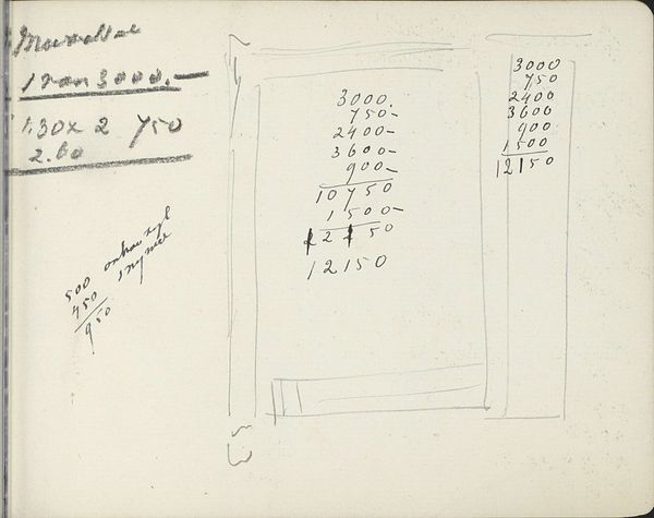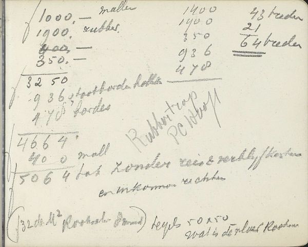 Curator: Here at the Rijksmuseum, we have Carel Adolph Lion Cachet's "Notities en berekeningen" – Notes and calculations – dating from around 1928. What’s your first impression? Editor: It’s… surprisingly captivating for what looks like a page of scribbled numbers. The overall effect, this intricate layering of pencil on paper, has an almost abstract quality to it, despite being so grounded in the concrete reality of mathematics. Curator: Indeed. Lion Cachet was clearly less concerned with neat arithmetic and more interested in the spatial relationships on the page. Look at how the different weights of the pencil strokes create depth. Notice the intentional disruption of an otherwise rigorous and consistent linear order. The composition avoids uniformity, inviting visual exploration across the network of figures. Editor: Absolutely. And given the era, post-World War One, I wonder how such mundane accounting intertwines with, say, artistic patronage and support. These notations hint at an economic support system underlying the art world during a tumultuous period. We might speculate who paid and who benefitted. What does the document suggest about the social ecosystem surrounding art? Curator: Very astute. Also, the choice of pencil on paper – an unassuming, easily accessible medium – draws attention to the raw process of conceptualization. In contrast to elaborate calculations using pen and ink, these are very intimate and improvisational scribbles, reflecting the preliminary stage of thought. And yet, those geometries and abstract symbols resonate across different areas and movements in art from the early 20th century. Editor: To think, these casual jottings open a window onto not only a person’s private calculations, but perhaps also the larger cultural shifts that art embodies during its moment in history. What starts as a simple accounting document quickly develops as a mirror reflecting socio-economic pressures and influences. Curator: It challenges us to find beauty in the functional, doesn’t it? To appreciate the inherent aesthetics present even in mundane documents when the creator has a compositional sensibility? Editor: It certainly does. I am reminded that all forms of record-keeping, and documents, often carry far greater socio-historical weight than the face value of their content may indicate. Thank you for sharing the drawing!