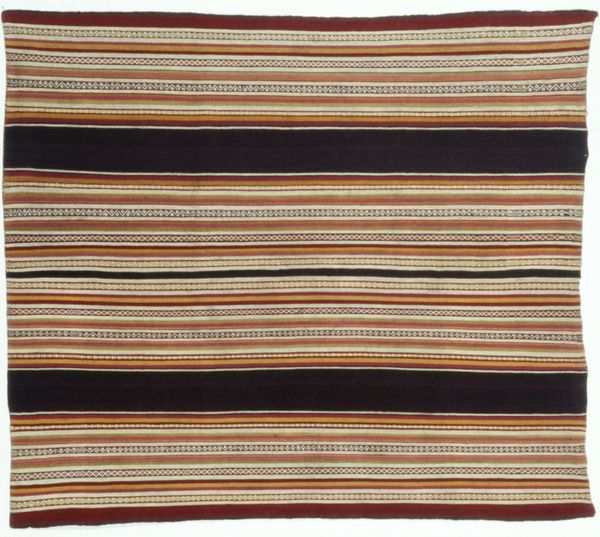 Editor: So, this is "Man's ponchito," made by an Aymara artist around the mid-19th century. It's a woven textile piece, and immediately I’m struck by how grounded it feels, you know? Earthy tones, a solid design… Almost comforting. What do you see in this piece that jumps out? Curator: Grounded, yes, but consider also the word "carried." Woven objects carry stories. Imagine the hands that labored over this, the wool itself, once grazing under an Andean sun. Notice the stripes? Not just decoration, I suspect. Possibly narratives, familial histories woven into the very fabric. Is it speaking to you? What do you imagine hearing? Editor: That makes me think of, like, coded messages! So, the different colors, the varying widths of the stripes… they could mean different things to different viewers, maybe even to the wearer themselves. It’s like a secret language, almost. Curator: Precisely. Textiles were and are never mute. I wonder: what if each line is a journey undertaken, each color a season witnessed, each geometric flourish a prayer whispered? And then, consider the purpose of a poncho, protection from the elements… it becomes a portable haven, doesn’t it? Editor: A portable haven! I love that! I had just been thinking about the design, but considering the function makes it so much richer. It’s not just a pattern; it’s a purpose. I’ll definitely look at textiles differently now. Curator: And I'll wander off with the happy image of the colors whispering of journeys, which may very well include the journey of art discovery for you.