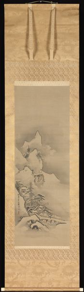Curator: Well, look at this gorgeous wash of tranquility. Kano Tan'yu painted this landscape in 1662, rendering it in ink on paper. It’s titled "Summer Landscape" and you can see it at the Metropolitan Museum of Art. Editor: A cascade of greys. It’s got such a subdued and ethereal quality, almost like a memory of a landscape rather than a portrait. The limited color palette certainly amplifies that effect. Curator: It does evoke a certain distance, doesn’t it? In landscapes like this, it’s crucial to note that the lack of vivid hues steers us towards symbolism. The waterfall becomes a visual echo of purification, renewal… washing away the old, so to speak. It’s the constant of change rendered beautifully still. Editor: Water as transformation – that resonates. I’m struck by the composition. The mountain peaks fading into mist, and the bold foreground branches with such assertive detail. This really draws my eye into a meditation on perspective. It makes me wonder what that little hut next to the waterfall represents. Is it just the scale comparison, or something deeper, some longing for escape? Curator: The hut could certainly signify that refuge and the ideal of detachment from worldly cares so dear to Zen Buddhism. Perhaps this scroll was meant to be a tool for contemplation, inviting the viewer into a state of peaceful self-reflection. And this tension between near and far certainly adds depth to the scene. But I also notice a clear sense of harmony... Everything flows together so effortlessly. Editor: Yes, it's far from chaotic, isn’t it? More an invitation to breathe deep, and take in nature in measured doses. These ink paintings remind us that in life, like in art, what we omit can be just as telling as what we show. What lingering feeling will you take away from "Summer Landscape"? Curator: The potent image of constant rebirth. Perhaps it serves as an encouragement to surrender to life's currents with a sense of acceptance and an unwavering curiosity, always searching beyond that mist.