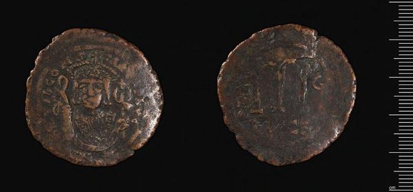 Editor: Here we have a coin of Mattathias Antigonus from Jerusalem. Given its weathered state, it feels quite ancient and weighty, both literally and figuratively. What strikes you about its composition? Curator: The coin presents a fascinating study in relief. Notice how the artist manipulated the surface to create depth, drawing the eye into the central motifs. The material's inherent properties—its metallic sheen and density—contribute to the coin's perceived value and authority. Editor: So, it’s all about how the coin’s physical characteristics create meaning? Curator: Precisely. The coin's design and material speak to the power and the ruler who commissioned it. Editor: I never thought of a coin having so much to say about its materials. Curator: Indeed. A close look at an object's intrinsic qualities often yields the most profound insights.