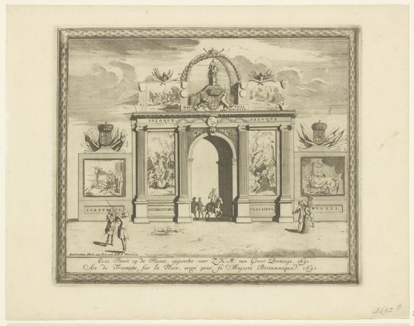 Curator: Here we have an etching and engraving by Emile Pierre Maria Spruyt, created in 1872. The piece is titled "Diploma van Maatschappij de Vrienden der Doofstommen te Antwerpen met bovenaan een portret van Charles Michel de l'Epee"—quite a mouthful! Editor: My eyes are immediately drawn to the architectural elements. The arch, the columns…it gives such a sense of formality, almost like a stage setting for a historical event. The precision of the lines, too. Curator: Indeed. Spruyt was depicting the diploma issued by the Society of Friends of the Deaf and Mute in Antwerp, topped by a portrait of Charles Michel de l'Epee, a pioneer in deaf education. The visual language employed suggests that the organization wishes to be taken seriously and for the certificate to look of the highest standard. Editor: It's interesting to consider the materials, isn't it? Printmaking allowed for the widespread dissemination of this document. To have it mass-produced meant the organization’s message reached a broad audience. The textures created with etching and engraving must have demanded very specific skills of labor. Curator: Absolutely, and the choice of etching and engraving connects the work to a well-established tradition of academic art, giving legitimacy to both the Society and its mission. Editor: And it shows how a document of recognition becomes an artwork itself, celebrating both achievement and the skill involved in its creation. There’s also that contrast between the sharp, precise architecture and the looser, more fluid depiction of the figures below. Curator: That juxtaposition speaks to the values the Society likely sought to embody: combining reason, order and care for those who had been previously marginalised. It’s also worth considering the social role of institutions like this in 19th century Antwerp. The representation here seeks to align the society with benevolence and tradition. Editor: Looking at it with a modern lens, though, it’s a potent reminder of how societal attitudes have evolved. The visual formality does have an aura of exclusion. Curator: Perhaps, but considering the context, it’s a fascinating window into a specific moment and mindset around deaf education and social progress. Editor: Definitely, thinking about this work and the choices of the artist—its means of production and consumption—highlights an under-appreciated aspect of social history, wouldn't you agree?
