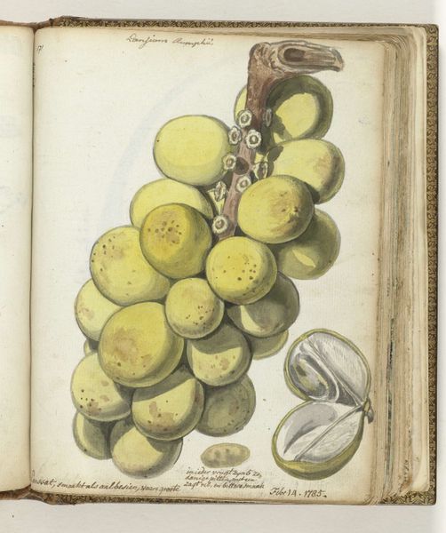 Curator: Look at the delicate detail in this study, titled "Ananas," made around 1785 by Jan Brandes. It appears to be a rendering in watercolor and colored pencil. What's your initial take? Editor: Visually, it strikes me as both meticulously observed and strangely fragile. The pineapple seems poised to disintegrate, despite the detail. There's a tension between the solidity of the subject and the ephemeral quality of the medium. Curator: Indeed. I'm drawn to the exoticism embedded within its production. Brandes was traveling, documenting botanical specimens. Think about the social context—pineapples were rare, imported delicacies representing wealth and colonial trade networks. This image becomes a material record of global exchange and consumption. Editor: That’s compelling. But considered formally, the interplay of the greens, reds and yellows also creates a captivating texture, doesn't it? The artist masterfully renders the spiky exterior and plays with light and shadow to define the form. Look at the individual cells and how they combine to describe its complex shape. It’s a structured investigation into the anatomy of a fruit. Curator: And those pigments, where did they originate? Were they locally sourced near Brandes's travels, or traded commodities themselves? Each stroke carries the weight of production. Even the paper has its own story of manufacture and distribution. It is crucial not just to observe but deconstruct how such an image came into existence. Editor: I agree, but there's also something to be said about the emotional quality evoked through this detailed representation. The pineapple almost has a personality, wouldn't you say? There's something vulnerable about the rendering of the form and the deliberate imperfection. It breathes life into something inanimate. Curator: Certainly, Brandes captured the fruit in a moment. Yet the layers of labor behind this art—from cultivation to artistic depiction—demand a consideration of social history alongside aesthetic analysis. Editor: A final, intriguing confluence of colonial contexts and a sensitive rendering of an exotic commodity, frozen in time by skilled draftsmanship. Curator: Yes, Brandes has really prompted a revealing encounter.