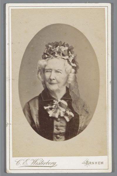 Curator: I see such a sense of gravity in this image, a still life with a soul looking back at us. Editor: Indeed. We're looking at an albumen print titled "Portret van een vrouw met muts", or "Portrait of a Woman with Bonnet," attributed to Ghémar Frères, dating roughly between 1860 and 1894. Curator: The texture of the print has such tactile, milky depth... It's mesmerizing how the image, caught between such precise period framing and slightly soft focus, allows her steady gaze to punch through time. Editor: The "carte de visite" format, immensely popular then, democratized portraiture. Suddenly, possessing an image wasn’t just for elites. Ghémar Frères ran a highly successful studio catering to the burgeoning middle class. These became objects of display, collection, circulation...tools of social visibility. Curator: Tools that shape visibility but what does she want us to *see*, this woman? Is it resolve or resignation etched around the mouth? Is the severe costume a shield or a reflection of expectation? So many riddles... Editor: The lace, both at her neck and as decorative flourishes surrounding the image itself, along with what appears to be a medal, hints at a certain status. I see more than a mere burgher. It makes you consider class anxieties in that era, who was attempting to project what. Curator: The entire photograph walks a tightrope between intimacy and a declaration of self. That ribbon on her bonnet, that slightly pursed lip - defiance. And how utterly human, even after all this time. It really asks us to wonder about the power that lay, or still does, in capturing an image, a frozen instant in the flow of time. Editor: Absolutely, a complex matrix of social practice and deeply personal expression... and a constant invitation to re-interpret our visual histories.