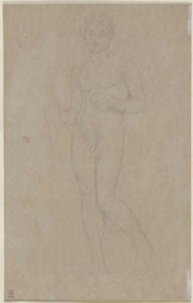 Curator: Looking at this artwork, "Study of a Nude Figure," created by Alphonse Legros, it seems he employed an etching technique using ink on paper. What strikes you first? Editor: A certain melancholic vulnerability. The lines are delicate, almost tentative, suggesting a psychological exposure rather than purely physical. There's an incompleteness, especially in the facial details, that contributes to this feeling. Curator: Yes, and considering Legros’ broader body of work and his social context, this rendering feels like more than just an academic exercise in depicting the nude male form. Think of the pre-war anxieties. This work could be a subtle commentary on the fragility of the male ideal and shifting perceptions of masculinity. Editor: I'd agree that its public reception is key. A piece like this appearing in certain journals would have held immediate connotations based on that journal’s existing political stance, subtly influencing interpretations of masculinity. And of course we must always remember to account for issues of queer visibility. Curator: Absolutely. Furthering your point, this print participates in an evolving visual language, especially with the rise of mass media. What does it mean to reproduce the body in this way, making it available for public consumption, particularly concerning ideas about class and artistic ownership? Editor: And beyond Legros’ intentions, we can examine the gaze imposed on the figure. The vulnerability could be read as submission or perhaps a commentary on power dynamics inherent in artistic representation. It is always necessary to remember the intersectional oppressions operating on both the artist and subject. Curator: Ultimately, examining Legros' work invites us to confront not only aesthetic concerns, but also the socio-political contexts that shape our perceptions of beauty, gender, and identity. Editor: Agreed. This figure stands as a potent reminder that art can function as a visual register of cultural anxieties, opening possibilities for reinterpreting what may first seem as purely academic subject matter.