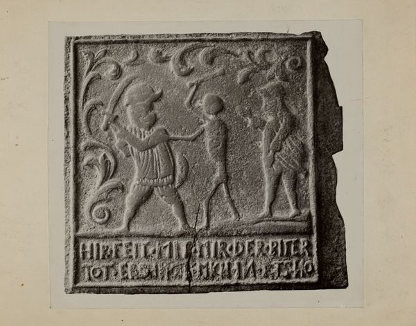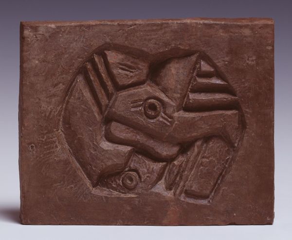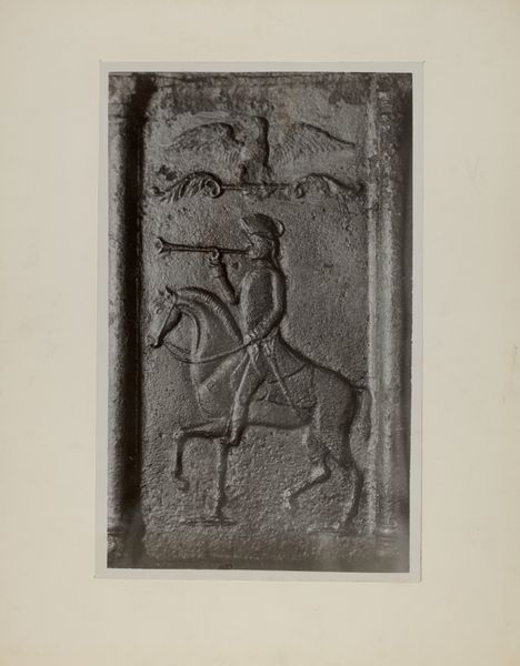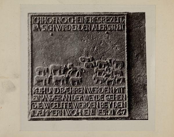 Editor: This is a Pa. German Stove Plate, circa 1936. It appears to be a stone carving, perhaps a relief. There's a certain charm in the simplicity of the forms. The image features two birds, a set of branches, and a date. I find it rather grounding. What do you see in this piece? Curator: Indeed, grounding. What strikes me first is the manipulation of form and space. Note the strategic placement of the avian figures and the stylized date "1762," or rather its abstraction, into near ornamental design. The relationship between the positive relief of the birds and date and the negative space carved around them establishes a visual harmony. How does this interplay contribute to your understanding of the work? Editor: I see your point! It seems almost like a symbolic dance across the stone's surface. So the deliberate contrast isn’t just decorative? It communicates… what exactly? Curator: Precisely. The artist’s manipulation directs our gaze, yes? Notice how the coarse texture of the stone emphasizes the starkness of the figures. The overall composition has a deliberate structural unity. Can we say this structural balance is integral to experiencing the piece beyond the mere depiction? Editor: Absolutely. It makes the imagery pop. The rigid and balanced frame versus organic central carving… Curator: How do these counter-elements contribute, perhaps creating tension between control and spontaneity? Consider how the work is not merely an image, but also a three-dimensional object. Its presence affects our perception. Do you see how the materiality alters the artistic statement? Editor: The depth and texture really add to it. I originally thought it was flat. Curator: The interplay between depth and the two-dimensional imagery of the piece enhances its physical nature, leading the viewer toward a tactile encounter, don't you agree? Editor: This changed the way I view it now! Thanks for breaking this down for me. Curator: An insightful beginning! I leave this exploration enriched by our exchange, ready to bring my observations on the road.