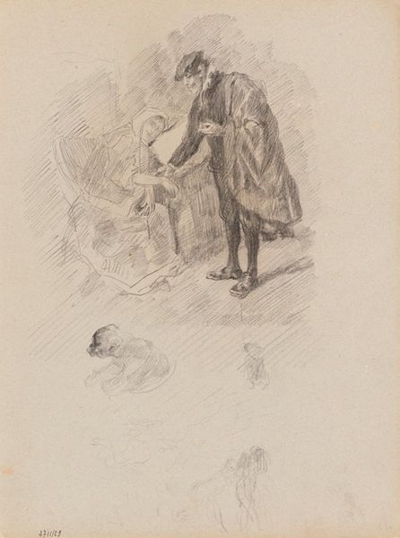 Hubert Robert sketched "Woman and Smaller Male Figure on Grand Stairway" using graphite, capturing a scene dominated by architectural grandeur. The composition, though lightly rendered, uses a high vantage point, emphasizing depth and the imposing scale of the staircase. The loose, gestural lines create a sense of movement and immediacy, inviting the viewer to imagine the implied narratives of the figures. The woman, larger and more detailed, anchors the composition, while the smaller male figure adds a note of contrast, suggesting themes of social hierarchy and observation. The starkness of the graphite on paper underscores a formal exploration of space and perspective. Robert challenges our perception of space. The artwork destabilizes the fixed and established notions of architectural rendering, opting instead for a dynamic, evolving interpretation. The sketch serves not just as a visual record but as an active engagement with the possibilities of representation.