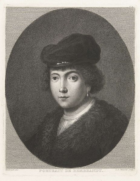 Editor: Here we have an etching titled "Luck" by Herbert Johnson Harvey. It's a portrait, seemingly a caricature. What's striking is the tonal range achieved through the etching technique. What's your take on it? Curator: Immediately, the hatching and cross-hatching demand attention. The artist masterfully articulates volume and texture using only line. Note how the density of lines around the face contrasts with the relatively sparse areas in the background and lower body. The strategic placement of these tonal variations gives this work its strength. Observe the orientation and direction of those etched lines and where and how they build up form. Editor: It’s fascinating how much information is conveyed with what seems like so little. The hat, for instance, is rendered with such economy of line, yet you feel its furriness. How do you think this emphasis on technique affects our reading of the portrait? Curator: Precisely! This isn't merely a representational portrait. The very *act* of etching – the controlled, deliberate application of line – becomes the subject, in a way. The sitter’s gaze also focuses our attention on *the means* of creating representation, drawing a direct connection between object and viewer. The material object, is its essence. Editor: So you’re saying the technique itself is foregrounded, almost more so than the person depicted? Curator: The emphasis on medium supersedes narrative or even likeness, turning our focus to the artifice of representation. It calls into question, ultimately, what are we seeing: the sitter or the hand of the artist, and the processes enacted to conjure an image out of base materials. Editor: I see, it makes you think about the process behind the artwork and the impact it has on what we're actually seeing. It’s like the artist is showing off what the etching technique can *do*. Thanks, this was very enlightening. Curator: My pleasure. Consider also how the materiality shapes our viewing pleasure as well, what do we aesthetically value in print media and what histories does this type of reproduction conjure in your mind?