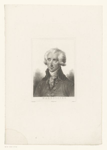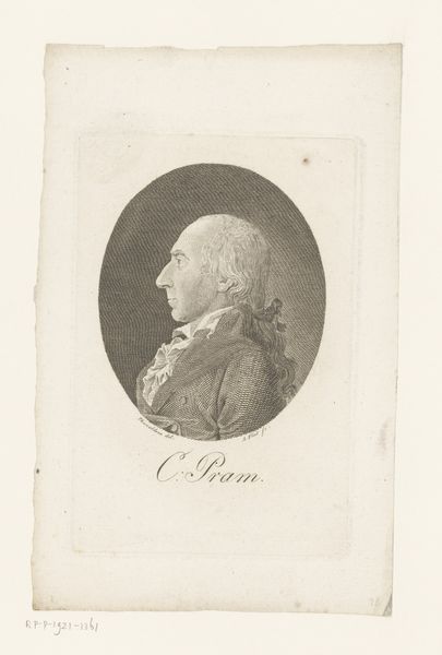 Luigi Calamatta created this print, titled "Portret van Chéron," using etching and engraving techniques. The composition emphasizes a profile view, framed meticulously to draw the eye to the subtle gradations of light and shadow which model the face. The subject's gaze is directed away, inviting contemplation on the direction of his thoughts. The texture, achieved through fine lines and cross-hatching, lends depth to the stark contrast between the powdered wig and the dark coat. Calamatta's choice of monochrome serves to highlight the formal aspects of line and form, while the precise engraving technique reflects a desire for clarity and order, aligning with the Enlightenment's emphasis on reason. This portrait can be seen as part of a broader cultural project aimed at capturing and classifying individuals, reflecting evolving notions of identity and representation.