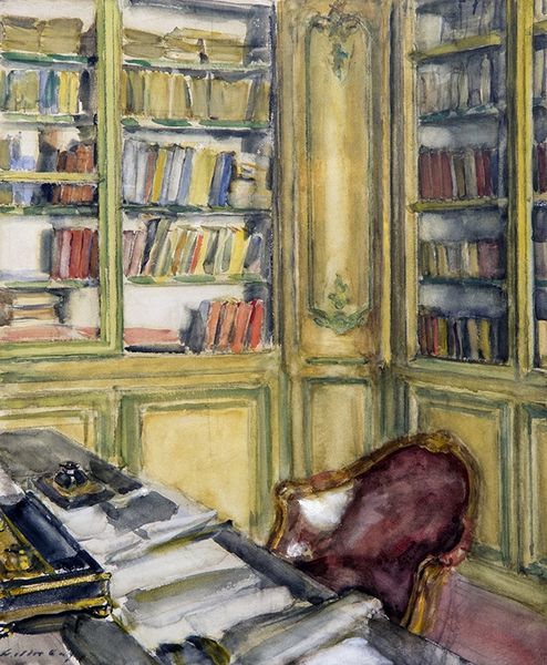 Curator: Looking at this painting, I am immediately struck by the quietness of it all, and also the obvious chaos around the subject, like it is a physical embodiment of what many artistic minds must go through to make the breakthrough idea come alive. Editor: I see that. We're standing before Edgar Degas' 1879 portrait of Edmond Duranty. Degas paints the novelist amidst the tools of his trade—books and papers overflowing from the desk in front of him. Curator: He certainly looks overwhelmed, or maybe just in deep contemplation. Notice how the books seem to press in on him from behind? And then the single lit candle and soft lamp. It makes the moment feel frozen, timeless even. This intimate portrayal of a literary figure speaks volumes. Editor: Absolutely. Degas avoids the usual heroic posture one might expect. Duranty's a modernist, in the thick of it. His posture is not perfect. It speaks volumes that Degas decided to capture him looking vulnerable, with a slightly ruffled exterior. And, as usual with Impressionism, note how the light glints off every surface in its own unique way. The dark, drab colors add to the introspective feel as well. Curator: Light certainly operates as more than illumination here. It highlights the interiority of the man, right? Considering Duranty's a champion of realism, that almost defiant lack of romanticizing him here is significant. Degas is not only painting Duranty but his values. The sea of literature becomes a supporting element in making Duranty seem well grounded in all that matters to him as an artist. The candle adds to this sensation of wisdom from experience. Editor: And what about those looming stacks of paper, or the fact that his quill seems to be resting aside idly while he clearly looks in thought about its coming utility? Curator: The creative struggle—plainly, he wants to get it just right, because he has clearly worked hard already. These elements together represent an interruption in the process. The human, fallible Duranty is briefly showing himself to us. Editor: Yes, exactly. The raw reality. This image serves as a poignant testament to modern genius. We're fortunate Degas froze this glimpse for us in time, don't you think? Curator: Very much so. Let’s leave our viewers here, to also revel in the painting's depths.