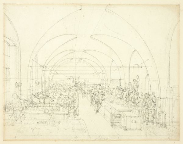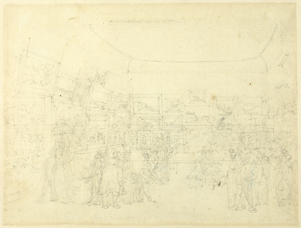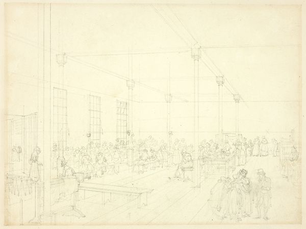 Curator: Here we have Augustus Charles Pugin's "Study for Corn Exchange, Mark Lane, from Microcosm of London," circa 1808. It’s a delicate drawing using graphite and etching on paper, currently residing here at The Art Institute of Chicago. Editor: My first thought is that it feels unfinished, yet teeming with potential energy. You see the skeletal architecture alongside these blurry, almost ghostly figures congregating within. It feels so provisional. Curator: Absolutely. Consider the context – this drawing served as a preliminary study for a larger publication illustrating London's key institutions. The Corn Exchange was a critical hub for trade, reflecting the economic power and social dynamics of the city. These figures, while gestural, represent that dynamism. Editor: It's interesting how that neo-classical architectural style – those dominating pillars! – contrasts with what appears to be the almost chaotic buzz of human interaction at ground level. Is this drawing attempting to convey social hierarchy, maybe through architecture’s imposed order? Curator: That's insightful. The neo-classical style, which gained prominence in the 18th century, projected stability and rationality through architectural order, and so its institutional power becomes palpable here. The figures occupying the space may or may not subscribe to these principles. So perhaps the drawing invites a subversive reading. Editor: What strikes me is who isn’t present: what classes, what races are represented in the marketplace? What does the composition’s implied exclusivity say about power, then and now? Curator: It asks us to consider who benefitted from and was able to actively participate in such economies. These prints, widely disseminated, shaped perceptions of civic life and social status, inevitably favoring some identities over others. Editor: The level of precision mixed with the implied energy tells a great story of its time period and perhaps still speaks today. I appreciate the contrast of form. Curator: Yes, the beauty in process, coupled with its implicit sociopolitical awareness – it gives one much to consider, even beyond the specific history of the Corn Exchange itself.
