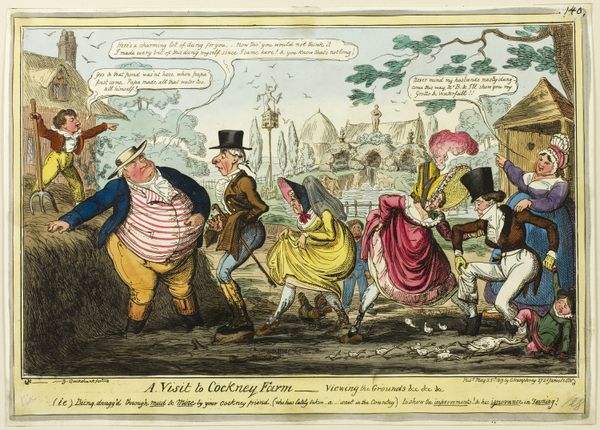 This hand-colored etching was made by James Gillray around the turn of the 19th century. As a print, its value lies not only in its visual content, but also its accessibility. Etchings, like this one, played a vital role in shaping public opinion in an era before mass media. The process begins with a metal plate, likely copper. Gillray would have used a sharp tool to etch lines into the metal, then apply acid to deepen them, giving it palpable texture. Ink fills these grooves, then the plate presses onto paper, transferring the image. Finally, it is colored by hand, with the addition of dyes and pigments. Consider the labor involved: the etcher's skill, the printer's precision, and the colorist's touch, all working to disseminate Gillray’s satirical message. The materiality of the print, born from collaborative work, underscores its function as a tool for political engagement, blurring the lines between art, craft, and social commentary.