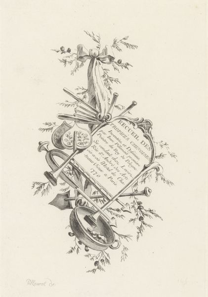 Johann Esaias Nilson created this print called "Cartouche with four musicians and a monkey" using etching in the eighteenth century. Decorative prints like this one were aimed at private consumption. A cartouche is an ornamental frame, often framing an inscription. Here, the inscription celebrates modern cartouches "accompanied by children". Around this, we see images of musical performance: we see figures with a harp, lute, and hurdy-gurdy along with a monkey. This represents the popular idea of art as a product of leisure for the aristocracy. This print offers a glimpse into the cultural values of 18th-century Europe, where art and music were seen as symbols of refinement and social status. Further research in collections of decorative prints and the history of musical imagery will illuminate the social function of this print. We may see the artwork as both reflecting and reinforcing the cultural norms of its time.