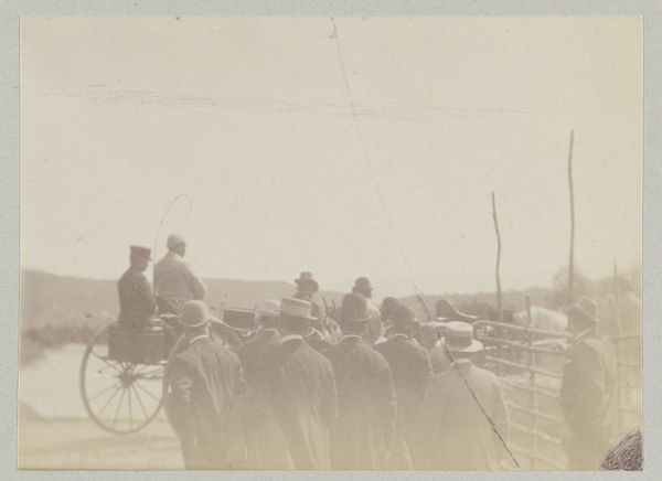 Editor: Here we have an intriguing photograph, "Onbekende personen die een mand meedragen," or "Unknown People Carrying a Basket," created sometime between 1920 and 1940, presumably. It's a black and white shot of several people walking away from the viewer, carrying things. It strikes me as quite candid; like we've stumbled upon a slice of everyday life. What stands out to you about this image? Curator: Well, looking at this through a historical lens, it's tempting to consider how genre paintings of the 19th century informed the practice of street photography, and how social values impacted the reception of the artwork. We can think about this in two ways. Firstly, what values were put on display by this representation? Secondly, what were the dominant interpretations of these people? The clothes are striking: do they signal local customs or labor? Editor: That’s fascinating! I hadn’t thought about the clothing as being potentially indicative of their social role or standing. Are you suggesting that the way they're dressed places them within a specific social context that would have been immediately apparent to viewers at the time? Curator: Precisely! It's important to consider how people viewing this image when it was produced would have interpreted these figures based on their clothing and actions. Is this presented as 'exotic,' 'picturesque' local life for external consumption or is this presenting a documentary image with an explicit social goal? Editor: So it could be a conscious portrayal, intended to document or even advocate for a specific community or social issue, or an outside, mediated depiction. The question then becomes: Who is this for, and why? Curator: Exactly. And what role might galleries or early photography exhibitions have played in framing those narratives? Editor: That gives me a whole new appreciation for the depth behind what I initially perceived as just a snapshot. Curator: It’s amazing how much history can be packed into one photograph!