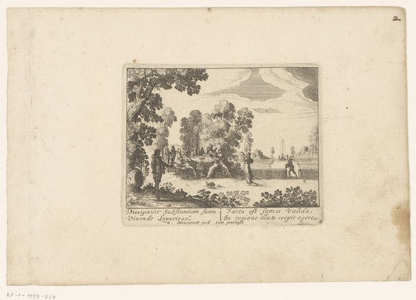 Editor: We're looking at "Landscape with a Stone Bridge" by Charles de Hooch, created around 1626. It’s an ink and etching drawing on paper, framed by a perfect circle. There's a stillness, a quietude to the whole scene. What leaps out at you when you look at it? Curator: It feels almost like gazing into a snow globe of the past, doesn’t it? The circular frame focuses your gaze. The simple lines tell of everyday life in the Dutch Golden Age. De Hooch captured not only the landscape but also, in some way, its soul. I see a harmony, a delicate balance between nature and human existence, the stone bridge itself a connection. Do you see it that way? Editor: I do. The bridge links not just the land, but also, visually, the little building on the left with the figures on the right. So the circle emphasises that link too, right? The whole composition, contained and almost dreamlike, tells a complete story. It almost makes you wonder what lies beyond its circular borders. Curator: Exactly! What secrets hide in the parts unseen? It prompts you to imagine the bigger picture. The artist isn't just showing us a place, but suggesting a feeling. He makes us participants, co-creators in the scene. It reminds us that art can be a conversation between the artist and the viewer, centuries apart, joined across time and space in shared contemplation. What an experience, huh? Editor: It's true; that sense of connection is strong. I’ll look at these circular compositions in a new light from now on. Thanks! Curator: My pleasure entirely. Isn't it marvelous how a simple scene can whisper volumes if you lend it your ear... and your imagination?