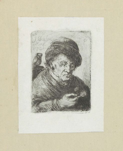 Editor: This is "Volwassen man, zijn rechterhand zichtbaar" ("Adult Man, His Right Hand Visible") etched by Jan Chalon in 1802. The mood feels intimate and somewhat unfinished, almost like a fleeting thought captured on aged paper. What stands out to you about this piece? Curator: Observe the strategic use of line. Chalon's economy of mark-making describes form efficiently. Notice how the density of hatching around the face and hands brings those areas forward, creating a focal point. How do you feel the artist employs light and shadow in this portrait? Editor: It's true, there is great nuance even with such spare marks. I see how light is used selectively to define the figure but would have described it more as a sketch. Curator: While suggestive of a sketch, we need to carefully study Chalon's precise strokes which denote more intention than an underdrawing. Are we truly observing a sketch when the tonality so exquisitely mimics three-dimensional form? Consider also how the materiality of the etching—the plate's own 'bite' on the paper—contributes to its aesthetic. It creates a texture and depth impossible to replicate with a simple pencil. What impact does this intrinsic texture have on your viewing of the work? Editor: That's interesting. I now see the depth more clearly and how texture brings volume to the figure. It seems that the artist focuses more on representing the individual's likeness, so it makes sense that his mark-making highlights volume and facial expression. I thought the print was hastily rendered. Curator: On the contrary, observe the confident draftsmanship and clear organization. Formally, the tonal gradations, linear patterns, and balance create an interesting dynamic. Ultimately, by considering how these different compositional elements affect our understanding of form, perhaps the idea of an 'unfinished' aesthetic reveals further complexity, even genius. Editor: I will never be able to unsee those strategic choices that impact volume! I hadn’t thought about texture playing such a crucial role, I will definitely need to remember to use a critical lens and look beyond just style!