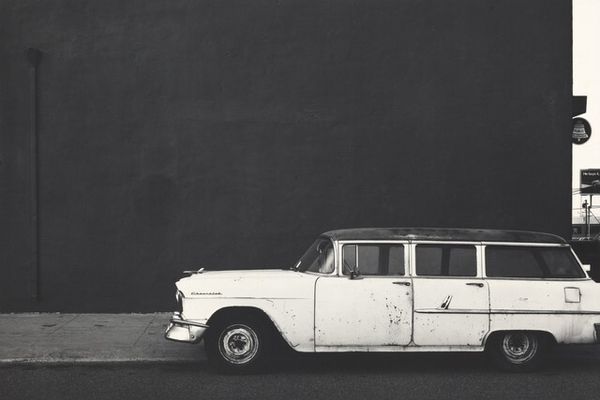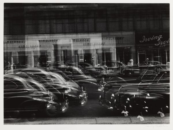 Curator: Immediately, the photograph plunges me into a noir-ish mood, a sense of mystery hanging in the dark spaces between those gleaming cars. Editor: That’s a fantastic entry point. The artwork we're looking at is "Park Avenue Garage, New York City," a gelatin-silver print by Louis Faurer, likely taken sometime between 1950 and 1980. What stands out is his choice to highlight these mass-produced objects in almost abstract shapes. Curator: Right. It feels more like an industrial study of form than just cars parked in a garage. You can almost feel the weight of the steel and the processes of its casting just from the photograph, that contrast is so clear, that this product has just come out from factories and that it means also wealth. Editor: Precisely. Thinking about it historically, consider Park Avenue at this time. It represented post-war affluence and social stratification. A garage full of such cars is a powerful symbol of American capitalism at its zenith, an aspirational emblem to the world, an aspiration materialized through metalworking. Curator: Definitely. And Faurer, working with gelatin-silver, manages to elevate the ordinary to the extraordinary. It's more than mere documentation, isn't it? Editor: Not at all. His framing asks: How does the culture of vehicle production shape our urban experience? It goes to the deeper politics of design. The material of mass consumption suddenly becomes the object of contemplation. Curator: Seeing it from that perspective makes me realize the power of such simple industrial products in defining social hierarchies. A photo can act as a really good study object, almost a sculpture of social values. Editor: And seeing through Faurer's lens, we can analyze how those social values are, in turn, manufactured and consumed. Curator: So the interplay of shadow and light really emphasizes this constant making and using... like the cars exist just for being parked, consumed… Editor: Yes, that tension makes it visually captivating while embedding deep social implications that invites re-assessment of urban living through its very industrial components.