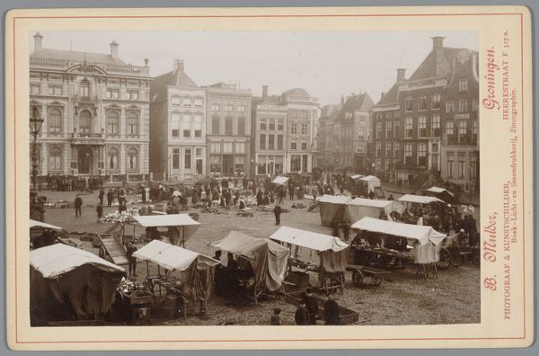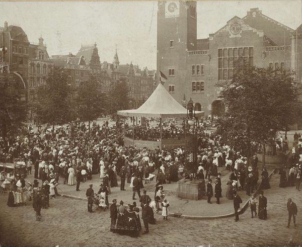 Editor: This is an anonymous gelatin-silver print from around 1888 or '89, titled "Optocht 'De Nassaus in de Nederlanden', 1 september 1888: de zevende groep (Amalia van Solms) op het Sophiaplein (Munt), Amsterdam." It depicts a dense crowd filling a city square, with impressive architecture as a backdrop. It feels like stepping back in time. What captures your attention most in this piece? Curator: Oh, the swirl of history caught in sepia tones! What I see is not just a cityscape frozen, but a hum of untold stories, whispered through cobblestones and chimney smoke. I wonder, can you feel the collective breath of this crowd, the weight of expectation clinging to the air? Look how the buildings, almost austere, observe this human theatre unfolding at their feet. Does this photograph give you the sense of a stage being set? Editor: Yes, definitely. There’s a sense of anticipation. The way everyone seems to be focused in a single direction really emphasizes that. Curator: Absolutely. It’s a curated moment, a performance for the lens, yet so candid, almost vulnerable, like a dream. This square is no longer just a space; it's a vessel holding collective memory, isn't it? Do you ever imagine what sounds filled this space? Editor: Now that you mention it, I do. Maybe the clip-clop of hooves, the murmur of voices, a brass band playing... Curator: Perhaps. And you become part of that history now, viewing, interpreting. What stories will you carry with you from this brief encounter? Editor: I think I'll remember the power of a single photograph to transport you, not just to a place, but to a moment brimming with untold stories. Curator: Precisely. Art, after all, is not merely seen; it is felt, experienced, and becomes a little echo within us, long after we've moved on.