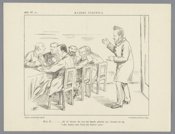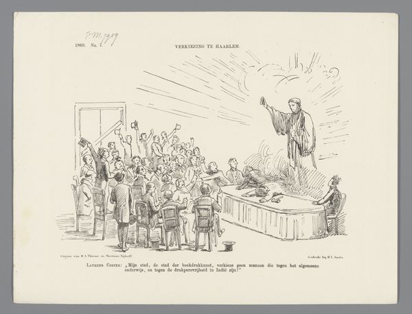In this 1871 drawing by Johan Michaël Schmidt Crans, we observe a classroom scene rendered with delicate lines and a clear structural composition. The linear perspective draws our eye toward the back of the classroom, while the figures are arranged across the benches. Schmidt Crans uses line and form to satirize the idea of co-educational schools. The composition is cleverly structured to contrast the teacher's focused isolation with the students' amorous interactions, highlighting a critique of the perceived chaos and distractions within mixed-gender classrooms. The arrangement of bodies and the subtle play of shadow suggest a deeper commentary on social order and the perceived disruption caused by mixing genders in educational spaces. The drawing employs the visual language of satire to engage with contemporary debates about education and social norms, inviting viewers to reflect on the structures that govern learning environments.