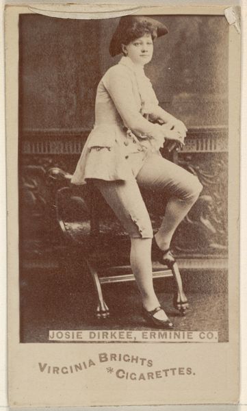 Editor: This is a portrait of Sadie Kirby, Erminie Co., an albumen print from the Actors and Actresses series made for Virginia Brights Cigarettes, sometime between 1885 and 1891. It's charming in a way, though a bit stiff. What’s interesting to you about a promotional item like this? Curator: It tells us a great deal about the relationship between celebrity, consumption, and visual culture in the late 19th century. Tobacco companies like Allen & Ginter were some of the earliest adopters of mass-produced photographic images. Think about it: photography, once reserved for the wealthy, becomes democratized, disseminated through something as common as a cigarette pack. Editor: So, this isn't just about selling cigarettes? Curator: Exactly! The cigarette cards also capitalized on the rising popularity of theater and vaudeville. By featuring actresses like Sadie Kirby, the company associated their brand with glamour, talent, and a certain aspirational lifestyle. They are essentially marketing aspiration and fame through ephemeral commodities. What's the cost of glamor here, so to speak? Editor: The cost is a pack of cigarettes! So it reveals a lot about marketing, maybe about how celebrity culture was emerging. It is fascinating that a fleeting image on a tobacco product can reflect so many deeper cultural trends. Curator: Precisely! This seemingly simple photograph really does speak volumes about the complex interplay between entertainment, industry, and the shaping of public desires during that period. I wonder what future cultural historians will find in *our* advertising. Editor: Food for thought, indeed! Thanks for that context.