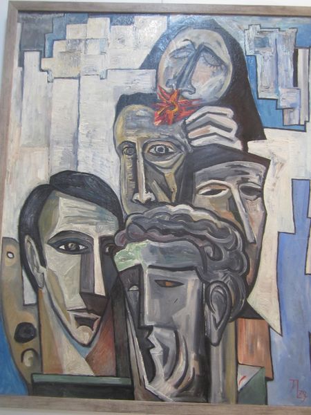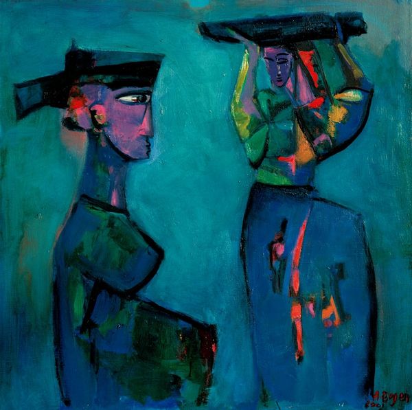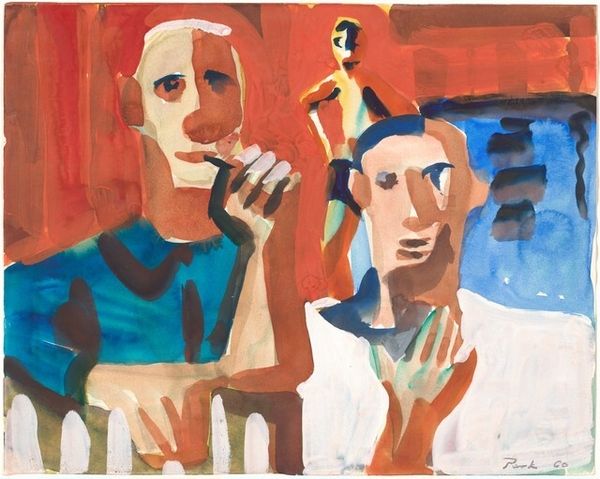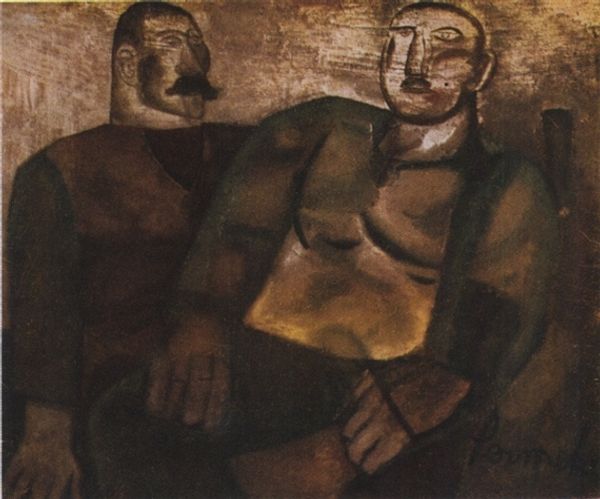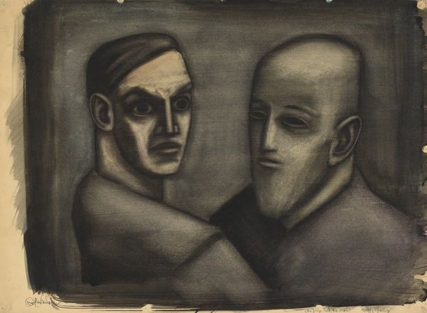 Charles Blackman created this Double Portrait using oil paints, applied in a deliberately crude manner. The thick, matte texture of the paint is evident, with brushstrokes that don't blend seamlessly, giving the figures a somewhat unfinished, raw quality. Blackman’s technique appears deliberately unrefined, and perhaps this aesthetic choice can be understood as a reaction against the slickness of modern industrial production. The rough surfaces and visible brushwork emphasize the hand of the artist, a direct engagement with the materials. The color palette, with its earthy tones and stark contrasts, is a crucial element. The heavy shadows and uneven application of paint contribute to the work's emotional intensity, suggesting isolation and uncertainty. In prioritizing process and materiality, Blackman elevates the act of painting itself. He shows us how the very process of making can carry social meaning.