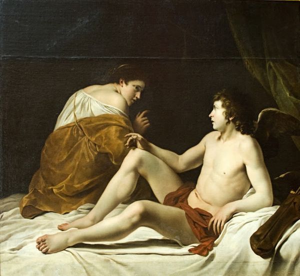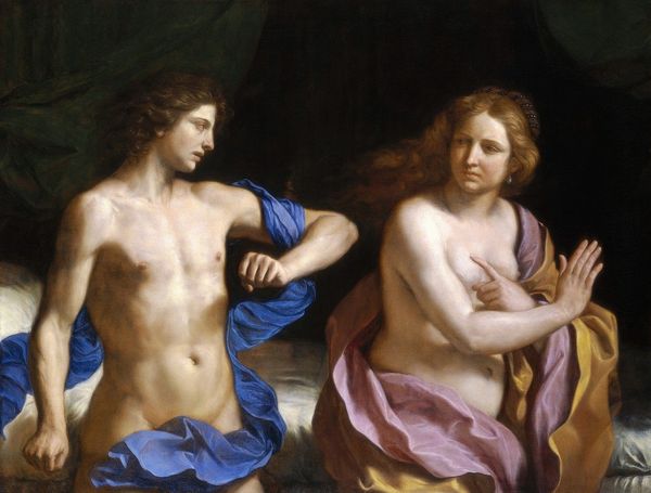 Editor: Here we have Paolo Finoglia's *Joseph and Potiphar's Wife*. The drama is palpable! What strikes me most is the power dynamic visualized here. How do you interpret this scene? Curator: Indeed. This biblical scene, often portrayed with voyeuristic undertones, here reflects a broader social commentary on power, gender, and coercion. Notice Potiphar's wife's active role—does it challenge or reinforce patriarchal narratives of female agency, or lack thereof, in 17th century art? Editor: That’s a great point. I hadn't considered the active role as a potential challenge to the norms. Curator: The painting becomes a site to question the historical representation of women and the dynamics of power they navigate. It prompts us to consider whose perspective dominates the narrative, and how that shapes our understanding of the scene. Editor: So true! It's amazing how much a painting can say about social narratives.