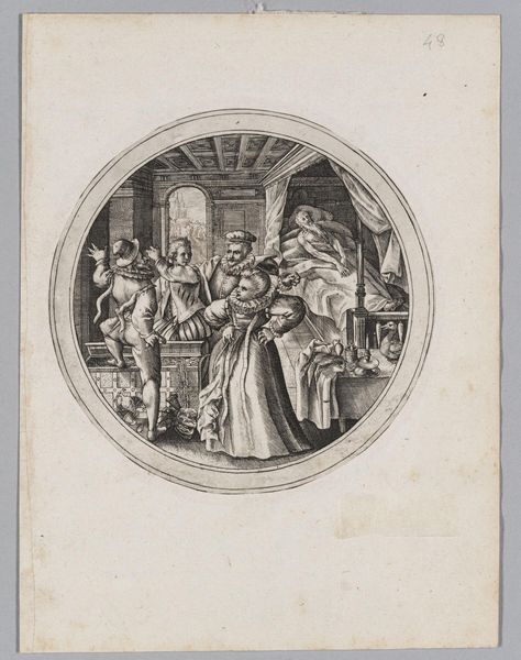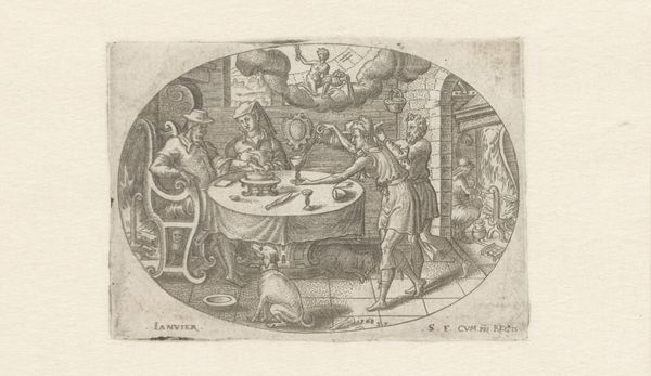 Editor: This etching is "The Ages of Man: Fifty Years," created by Crispijn de Passe the Elder. It's quite small, almost intimate. The circular composition draws my eye to the figures; there's almost a stage-like quality. What strikes you when you look at this image? Curator: The circle itself is intriguing, isn’t it? It feels like peering into a snow globe of domestic life. De Passe captures a moment—a toast perhaps? Life, encapsulated. The boy with his dog, the couple enjoying food and drink. A bit of daily life, immortalized. Do you think it romanticizes or criticizes this scene? Editor: Hmmm, I'm not sure. It’s both charming and a bit...stiff. Maybe that tension is the point? Curator: Precisely. It’s a dance between idealization and observation, isn't it? Life is, too. Editor: I hadn't thought of it that way. Thanks! Curator: My pleasure. Art is like life - the more you reflect, the more you see.