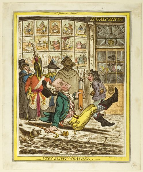 Curator: This print, "Quarter Day, or Clearing the Premises without Consulting Your Landlord," was created by Thomas Rowlandson. It's a flurry of activity, isn't it? Chaotic, even. Editor: Indeed, look at this overwhelming pile of possessions, precariously balanced on a cart. You can practically feel the stress and the struggle embodied in the raw materials—the wood, the fabric, the very paper of this print. Curator: It speaks volumes about the social and economic realities of the time. Eviction, a very public spectacle in the Georgian era, rendered visible by Rowlandson. Editor: Exactly. Consider the labor involved in producing and transporting all these goods, now displaced. It reflects the cycle of poverty and consumption that trapped many. Curator: And Rowlandson's ability to capture it with such vivid detail and dark humor makes it so compelling. The politics of imagery, on full display. Editor: It's a powerful reminder of the tangible consequences of social inequality, isn’t it? Curator: Yes, a history lesson etched in ink.