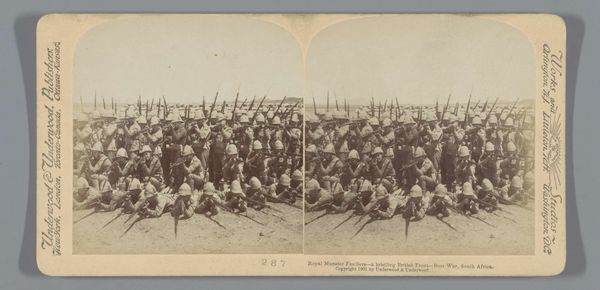 Editor: This gelatin-silver print, taken around 1900, is titled 'British soldiers drinking during the Battle of Paardeberg, South Africa.' The men all look exhausted. I’m immediately struck by the ordinariness of this moment captured amidst war. What’s your perspective on this, considering its historical context? Curator: It's fascinating how this photograph, likely meant to document or even celebrate the British military campaign in South Africa, simultaneously reveals the very human aspects of war often unseen in official narratives. Consider the rise of photojournalism at the turn of the century. Images like this had a profound impact on public perception. What kind of role do you think these played? Editor: Well, this one specifically? I imagine at the time, it would be easy for the Empire back in London to see just the camaraderie in drinking, the celebration, and ignore what seems like exhaustion of these men at war? I suppose photos such as this may be seen as both for and against imperialism. Curator: Precisely. Images disseminated through publications shaped public opinion. They helped justify or critique imperial ventures. Do you notice anything about the composition that could speak to this duality? The somewhat staged arrangement of the soldiers perhaps? Editor: Yes, they almost look like they're posing, even while supposedly in a moment of relief. Maybe it reflects the power dynamic – even at "rest," they're subjects of the Empire's gaze. Curator: Exactly. Even simple photographs are loaded with politics of representation. Reflecting on our conversation, how does this influence your understanding of documentary photography? Editor: I see that documentary isn't objective; the photographer's perspective and the intended audience always shape what is being presented and the values it upholds or critiques.