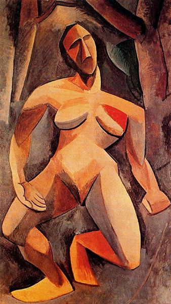 Here we see a painting of a female nude by Pablo Picasso. The composition is a complex arrangement of geometric forms and muted tones, which together evoke a sense of disquiet. The painting's power lies in its formal qualities. Notice how Picasso breaks down the figure into angular planes, disrupting our traditional understanding of form. The restricted palette enhances the sense of fragmentation, as the woman seems to emerge from a space of shadows. This use of geometric abstraction is consistent with the tenets of Cubism. Picasso wasn't merely representing the body but was exploring ways of seeing and representing reality. Consider how the composition defies traditional notions of beauty and representation. It’s a potent reminder that art can challenge our perceptions and invite us to question what we see and what we expect to see.