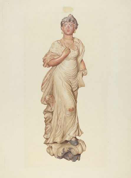 Curator: I'm immediately struck by the solidity, the palpable weight of this... drawing? It feels like sculpture rendered in charcoal. Editor: Precisely. What we’re looking at is "Garden Figure," a work whose creation dates somewhere between 1935 and 1942. Though we don't know the artist, its academic style makes me think about power structures within the artistic field at that time, where institutions validated this approach. Curator: The crossed arms—almost protective, but could it signal a lack of agency? Does she have power, or is it an enforced stillness? I wonder what sort of garden this figure would inhabit. Who commissions such a piece, and to what end? Is it purely decorative or symbolic in some deeper sense? Editor: Those are valid considerations. If we examine the marks more closely, there’s a density to the charcoal application suggesting that labor, time, and access to materials would have been required. There's no visible sketch or armature; each mark appears deliberate in the building up of form. It suggests a classical approach but then is mediated by the accessible material. Curator: Right, accessible compared to carving marble, for instance. But still, the final rendering reads as privileged, evoking notions of classical art without fully engaging in the labor involved. We must consider that even ‘humble’ materials are tied to social contexts, shaped by both intentional artistic choice and socio-economic conditions. I keep considering its potential as garden statuary—what narratives is she part of within the garden space and as a gendered image in the era it was created. Editor: Indeed. And a garden isn't some neutral locale but constructed with purpose reflecting power, leisure and control of resources. How did access to such an icon shift the purpose? Curator: Placing the work into context expands our reading and makes me realize how I cannot disentangle medium from messaging, whether I wish to read it so explicitly or not. Editor: Exactly! Every artistic choice carries baggage – choices related to materials are integral to the meaning, social context, and interpretation.