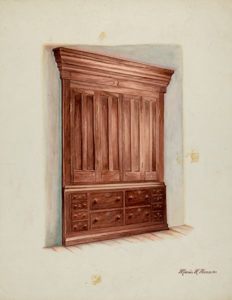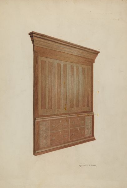 Editor: Here we have George V. Vezolles’s "Corner Cupboard," created around 1937, a drawing in pencil on paper. I'm struck by how the artist rendered this everyday object with such precision. What strikes you about this drawing? Curator: The primary fascination lies in the rigorous geometric organization. Consider the interplay of horizontals and verticals defining the shelving. Note how each plane receding into space subtly alters in value, delineating depth. Observe also how the open doors mirror one another, framing the internal architecture of the cupboard. Editor: The symmetry is definitely compelling. Is the medium itself significant here, that it’s a drawing, not the actual cupboard? Curator: Precisely! Pencil allows for a control over line and shadow that perfectly serves the objective recording of form. The neutrality of the medium also prevents any extraneous emotional distraction. Editor: So the focus is on pure form, the essence of the object? Curator: Precisely. This isn't about sentiment; it's an analytical exercise exploring structure through representational means. Ask yourself, what is gained or lost by distilling such a mundane object to such a precise visual study? Editor: I see now. It pushes me to consider the cupboard not just as a thing, but as an arrangement of shapes and shadows. Curator: And therein lies the crux. We begin to perceive inherent aesthetic qualities we might otherwise overlook. Editor: Thank you. Now I understand how focusing on the formal elements helps to decode and elevate this artwork!