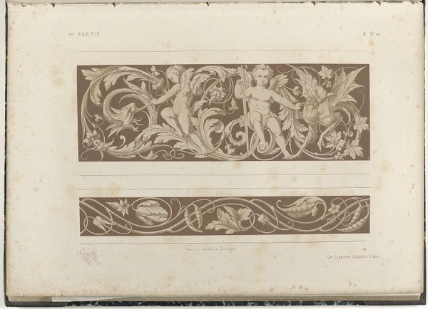 Editor: Here we have "Twee friezen," or "Two Friezes," by Michel LiéNard, created in 1866. They look like engravings, perhaps meant for some kind of architectural ornamentation? I find the contrast between the detailed upper frieze and the simpler one below quite striking. What do you see in this piece, Professor? Curator: Well, considering the material aspects, this print, as a reproduction, speaks volumes. It hints at a burgeoning market for ornament – an increased democratization of design, if you will. How easily could an artisan access and utilize this pattern, reproduced via engraving? What socioeconomic forces made that possible? Editor: That's a really interesting point. So, the accessibility of this print would influence its social impact and potential consumption? Curator: Precisely. Think about the paper itself. The quality, the cost – these factors dictated who could afford and use these designs. Is it mass-produced or bespoke? Its creation impacts access and utility. How does this affect notions of “high art” versus applied art or design? Editor: I never considered the social implications of just… the *making* of ornament before! I guess I always assumed things like this were solely about aesthetic appeal. Curator: And what is aesthetic appeal divorced from production? Where were designs like these likely deployed, and who benefited? Was this merely inspiration, or a call to reproduce such friezes on a grand scale? Considering the labour required for their realization might bring another dimension to it. Editor: It really shifts my perspective knowing the artist, LiéNard, was impacting a network of producers in that era. These aren't just pretty pictures but potential artifacts of labour. Curator: Exactly. By focusing on the materiality and modes of production, we move beyond just the image itself to understand the cultural landscape surrounding it. Editor: That really gave me some insights, I will definitely explore art with these aspects. Thank you, Curator!