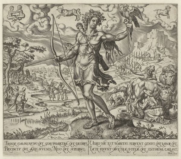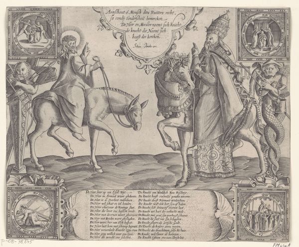 Curator: This engraving from 1534, titled "Allegory of Fortuna and Justice" is attributed to the Monogrammist HC, it presents a fascinating snapshot of Renaissance anxieties. What stands out to you? Editor: The figures are compelling and intricate. It feels crowded, but Justice at the center, blindfolded, trying to keep her balance on a globe, feels really relevant right now, but the banner across the top is interesting, almost hopeful. What am I supposed to see here? Curator: Well, the banner reads 'Justitia' and 'Fortuna', concepts central to the social fabric of the time. Look at how Justice isn’t just blindly impartial; she is precarious, isn’t she? In fact, what does it mean to see her unsteady, dominating the very thing it seems she represents? Editor: I see your point. I mean, shouldn't Justice be shown as unwavering, absolute? Curator: Exactly! This instability reflected the turbulent political landscape of the Reformation era, a world grappling with shifting power structures, class struggles and evolving definitions of morality. Look closely at the inscription blocks in the image -- they include a mix of Latin, German, and other dialects which are commenting on ideas of justice. Editor: That really emphasizes how diverse this moment in history was with new social issues, new ways to speak about problems, and how it connects to this representation of social upheaval. Curator: Precisely. This artwork isn't just an aesthetic object. The Northern Renaissance was wrangling not only with different cultures of politics and law, but the tension between individual destiny, public expectations, and religious authority. Where can these connect? Editor: Seeing it in that context, the image suddenly seems much more complex and provocative. Not just about ideals, but also the struggle to uphold them. Curator: Agreed. It serves as a potent reminder that justice and fortune aren't static concepts; they're constantly being negotiated within complex historical and social power dynamics.