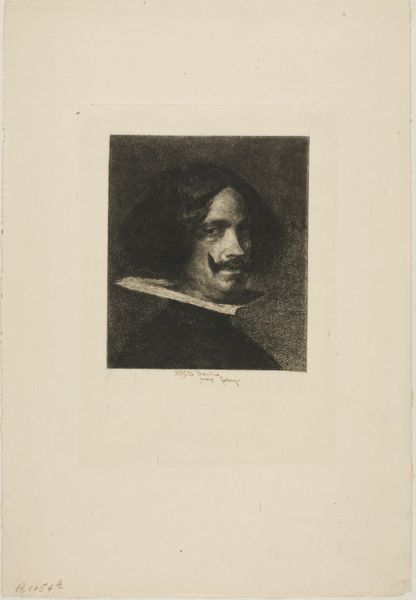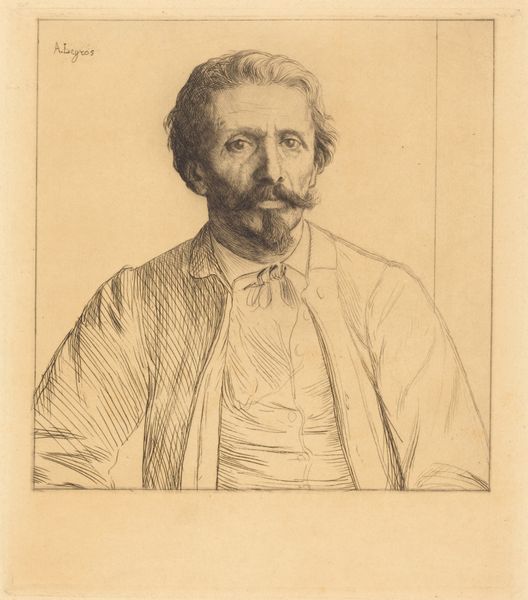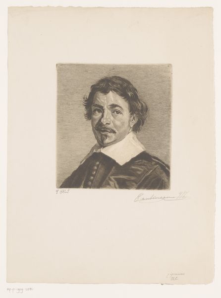 Léopold Flameng created this undated portrait of an unknown man with a stick using etching techniques. The composition immediately strikes us with its emphasis on texture and intricate detail. Flameng masterfully uses etching to create a surface that is both tactile and visually stimulating, drawing attention to the delicate lace collar and the rough texture of the man's hair. Notice how the contrasting light and shadow enhance the depth and volume of the figure, creating a sense of three-dimensionality. From a structuralist perspective, this portrait operates within a system of signs and codes, reflecting the social values and conventions of its time. The man's elaborate attire and dignified posture signify status and authority, while the presence of the walking stick can be interpreted as a symbol of power or support. Consider how Flameng's technical skill and formal choices contribute to our understanding of identity and representation in nineteenth-century portraiture. The artwork invites us to decode its visual language and to reflect on the complex interplay between artistic technique, cultural meaning, and individual expression.