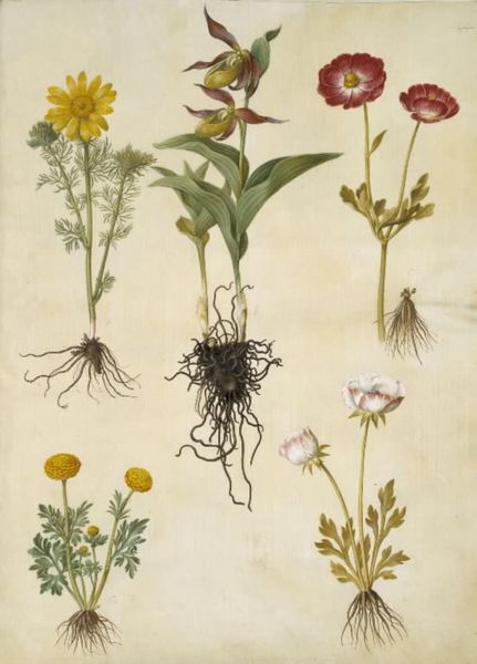 Editor: Here we have Holtzbecker's "Centaurea montana; Amberboa moschata" created sometime between 1649 and 1659. It is watercolor, gouache, and drawing on paper, and shows four different botanical specimens. What I immediately notice is the level of detail and precision. What stands out to you? Curator: The compositional strategy warrants immediate attention. Holtzbecker orchestrates a vertical alignment of distinct botanical forms, each asserting its presence with considerable clarity. Note the strategic employment of white space, effectively isolating each specimen, inviting discrete contemplation. Consider the texture, achieved by layering watercolor and gouache. The textural interplay yields a tactile quality, evoking a tangible botanical experience. Do you perceive a discernible pattern governing the arrangement of elements? Editor: I see that each plant occupies roughly a quadrant of the page, each rising vertically. They each have distinct textures created by what seems like very intentional brushstrokes. But, to what end? Curator: Precisely. Holtzbecker's artistic agency resides in the manipulation of visual syntax. Are we observing merely botanical documentation or a deliberate aesthetic construction? Reflect on the delicate gradations of color, modulating light and shadow. These elements contribute to an illusionistic depth, imbuing the specimens with a semblance of three-dimensionality. What might the root system in the lower left contribute to the reading of the image? Editor: It feels grounding somehow, maybe a reference to the origin and organic nature of the entire enterprise. I'm also seeing how much more vibrant the color is in this illustration compared to others from the same era. Curator: An astute observation. Ultimately, the Holtzbecker’s meticulous rendering invites speculation regarding the symbiotic relationship between art and science in the 17th century. A dynamic equilibrium between empirical observation and aesthetic formalism, would you agree? Editor: I think so. I came in seeing just pretty flowers but now I see a carefully designed study of both color and form! Thanks for walking me through this.
