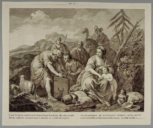 Curator: Pellegrino dal Colle's "Peasants and Cattle" presents a pastoral scene, offering a glimpse into 18th-century rural life. Editor: The initial impression is one of tranquility, wouldn't you say? The arrangement of figures, animals, and landscape elements evokes a sense of calm and domesticity. Curator: Consider the etching technique, though. Note the detailed lines used to depict the varying textures, from the rough-hewn fence to the soft wool of the sheep. This labor-intensive process speaks to the value placed on craftsmanship. Editor: Absolutely. The cow, centrally placed, becomes almost a symbol of fertility and provision, reflecting the era’s deep connection to the land and the agrarian cycle. Curator: And the family unit—the mother with her child, the other figures engaged in quiet activity—highlights the social fabric woven through agricultural work. It's a very structured composition that reinforces societal values. Editor: A compelling image, showcasing both the simple life and the embedded cultural meanings. Curator: Precisely; it prompts a renewed look at the materials of everyday life.