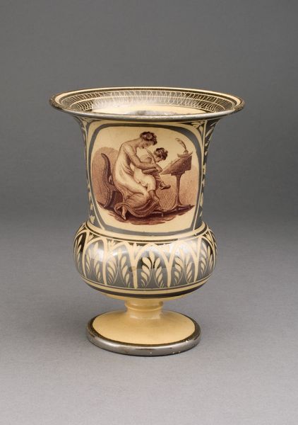 This beaker depicts the battles and warfare of different tribes in Mozambique, as described and imagined by the Dutch merchant Jan Huyghen van Linschoten (1563-1611), who had lived in Goa, India, for six years, and wrote an influential account of his travels through Africa and India. It was made in Leipzig, Germany, which was a center of trade, based on engravings in Jan Huyghen’s book. Such depictions of exotic peoples in faraway places were not always accurate. Here a Mozambiquian chief is pictured as a Native American.