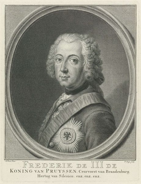 Editor: So, this is a 1770 engraving by Jacob Houbraken titled "Portret van Pasquale Paoli." It's quite formal, very baroque in its presentation, wouldn’t you say? What strikes me is the detail in the clothing versus the relative smoothness of the face. What do you see in this piece? Curator: Well, immediately I think about the context. By the late 18th century, prints like these were crucial for disseminating images of important political figures. Paoli was a Corsican patriot and general, a figurehead for republican ideals and resistance against Genoese and, later, French rule. Consider the political climate and the function of this image, and whether that was propaganda. How does it portray Paoli? Editor: As a powerful, respected figure, definitely. The oval frame gives it a sense of importance. But wasn't Corsica a point of contention between different powers? Curator: Exactly! The image plays a role in shaping public opinion and lending legitimacy to Paoli's cause. We can see this work not just as a portrait, but as a statement on the politics of liberty and resistance in the late 18th century. Consider its relationship to the print market. Who was commissioning these? Editor: So it's less about capturing a likeness and more about constructing a political persona? I hadn't thought about prints being used like that, so overtly. It really puts the "portrait" into a new, social context for me. Curator: Precisely! The Rijksmuseum showing it speaks volumes about how they contextualize it today, shifting meanings across time.