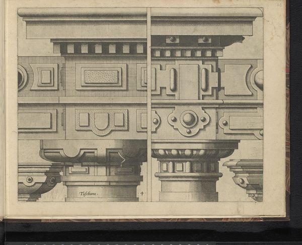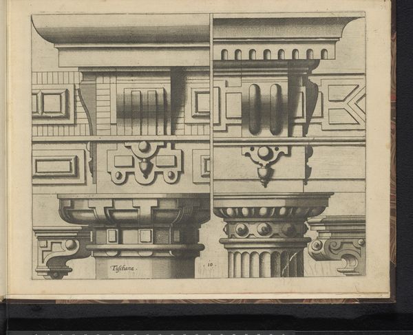 Editor: This print, "Details of Entablature and Capitals, and Two Consoles," by Joannes van Doetecum, showcases architectural elements in crisp detail. What's striking is how these classical motifs are presented divorced from any specific building; what do you make of that? Curator: It's a fascinating question! This presentation speaks to the role of architectural prints in disseminating knowledge. These images facilitated the spread of classical styles. How might such images impact architectural practices? Editor: So, this isn't just about aesthetics, but about the practical influence on building design? Curator: Exactly. It highlights how printed images shaped architectural discourse, and how easily accessible visual information could influence design choices and trends across different regions and social strata. Editor: That makes me think about how architectural styles become symbols of power and influence. Curator: Precisely! This print, in its own way, played a part in that process.