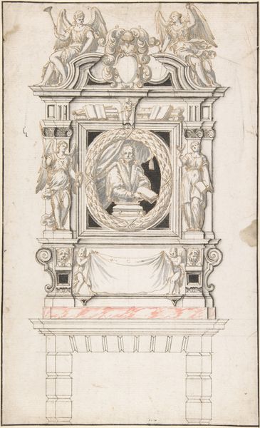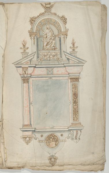 Curator: So, what's grabbing you first about this intriguing piece? It's entitled "Ontwerp voor een altaarstuk met vijf compartimenten," or, "Design for a Five-Compartment Altarpiece," and it was created sometime between 1490 and 1556 by Girolamo da Santacroce. It’s an ink drawing on paper. Editor: Honestly? It feels like a whisper from the past. All soft lines and gentle shading; I get a devotional and ethereal feeling, like I'm peering into someone's most heartfelt prayer. I really am loving the architecture too. Curator: Absolutely. Contextually, altar pieces in the Renaissance were powerful didactic tools. They were tools that spoke volumes about religious and social order. The design here emphasizes hierarchy—notice how the central figure is elevated above the others? It speaks to systems of power that permeate societal structures. Editor: And you feel the almost ghostly quality really underscores the weight of tradition, the passing down of those structures, doesn't it? And while the piece is understated there's definitely beauty to the precision, with these small architectural details hinting at future artistic innovations, especially within the sacred art form. Curator: I couldn’t agree more. Consider that religious artwork wasn’t solely about faith; it mirrored gender dynamics, often representing women in very particular ways, think passive or allegorical figures versus empowered leadership roles, for instance. The artist here adheres to many such established tropes and representational constraints. Editor: Mmh, interesting. It is hard to tell the identities of the women portrayed but for me I love trying to decipher who might've commissioned this design; to imagine their hopes and desires mirrored back at them by art, within the devotional act... It must have been like gazing into a sacred mirror of one’s own soul. Curator: Indeed. In its materiality alone this piece invites a profound meditation, not only on Renaissance sacred art but also the intersecting currents of class, identity, and cultural authority that art of this era so faithfully—if also problematically—preserved. Editor: Well, its imperfections just feed the dream and mystery for me; it makes the original design even more human, doesn’t it? Curator: Yes.