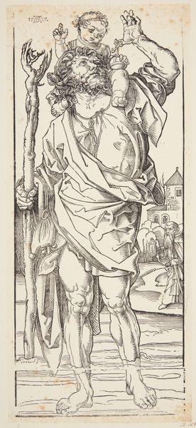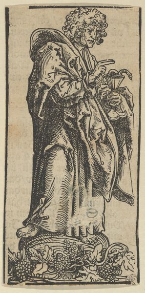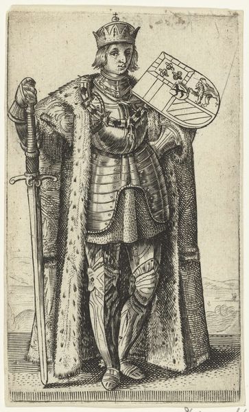 Lucas van Leyden created this woodcut print, "Portret van Dirk, eerste graaf van Holland," in the early 16th century. The work is striking in its vertical composition and the stark contrast between light and shadow, achieved through dense, intricate lines. This use of line not only defines the figure of Dirk but also evokes a tactile sense of the fabric and textures of his clothing and the banner he holds. Consider the structural implications of this medium. The lines, deeply etched, create a sense of volume and depth, despite the print's flatness. The figure stands rigidly, a heraldic lion atop his banner, suggesting power and authority. Yet, the visual language of the woodcut, with its inherent simplicity, subtly challenges these notions. The starkness could also serve to demystify or scrutinize the traditional portrayal of nobility. The work exists within a complex historical and semiotic context. It's not merely a portrait but an examination of representation itself, inviting us to question how images create and sustain cultural narratives.