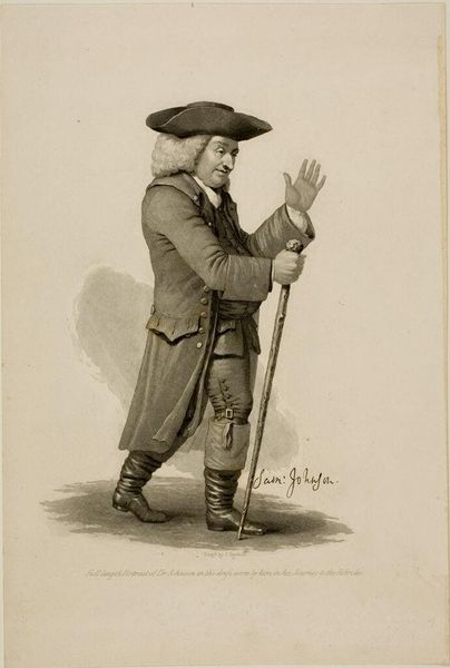 Editor: Here we have "Major General John Sullivan," a charcoal drawing, printed in 1776. There is a solemn intensity to this man; it almost feels like he is staring right through you. What catches your eye? Curator: Oh, where do I even begin? It's a face that speaks volumes, isn’t it? The artist, with those stark contrasts, manages to freeze a moment of revolution, uncertainty, and perhaps even a touch of reluctant heroism. Note the way his hand grips that spear. There's a story in that grip. Editor: Reluctant heroism, I like that. I hadn’t considered that perspective. Curator: Think about it, the weight of responsibility suddenly thrust upon a person. And it is just my hunch, but this artwork seems to convey the weight that historical moments placed on individual consciences. But, really, it all lands on the viewer doesn't it? You read the spear differently than I might. Editor: I can see that. I focused so much on his direct stare; now I also wonder about the forest setting. Is there a meaning or purpose for the forest scene behind him? Curator: Well, the backdrop almost certainly locates the scene in the New World, it’s a compositional tool, of course. Also, in 1776, consider the political climate. What sort of visual rhetoric might such scenery lend? Editor: I’m seeing now, it emphasizes the landscape that they’re fighting to defend. Curator: Exactly! It is a visual reminder of what's at stake. Every element tells a story, or perhaps, nudges us toward one. This artwork really makes us work with it. Editor: Looking at it this way, I realize it’s more dynamic than I first thought. I was stuck on just the general’s somber face. Thanks so much for pointing this out!