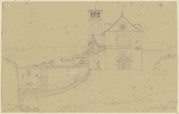 Curator: This is a quick sketch by George Chinnery, dating from his time in Macau. It's currently known as '[title not known]' and kept at the Tate. Editor: It’s wonderfully ephemeral, like a memory fading into the sepia tones of time. There's an almost dreamlike quality. Curator: Chinnery was a fascinating character, dodging debtors in India and then setting up shop in Macau. His art is full of the complexities of colonial life. Editor: Look at the delicate lines outlining the church facade, the way the figures are almost ghost-like. What does it say about power, about presence, about absence in a colonial context? Curator: Perhaps it’s about capturing a place in flux, a fleeting moment on the edge of empires? Editor: Possibly. The sketchiness emphasizes the tenuous grip of colonial powers, the impermanence of architectural and political structures. It is less about grandeur, more about transience. Curator: Yes, it’s a reminder that even the most imposing structures are just sketches in the grand scheme of things. Editor: A powerful thought to take with us.