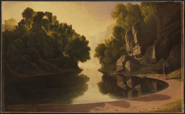 Curator: Paul Kane’s 1846 work, "French River Rapids", is a remarkable glimpse into the Canadian wilderness. Editor: My first impression is the sheer amount of manual labor seemingly captured here. I am drawn to the individuals on the shore navigating that canoe. Curator: Absolutely. Consider Kane's role in this historical tableau. He presents a narrative laden with themes of encounter, specifically Indigenous peoples and European colonizers depicted in the context of arduous physical labor. The composition, particularly the human figures arranged alongside the watercraft, foregrounds this labor. How might we contextualize this image within the historical realities of the fur trade and resource extraction? Editor: From my perspective, the use of oil paints is central. Observe how it renders the texture of the rocks, the fluidity of the water, even the cloth of their clothing. The very application of paint creates layers reflecting the materiality of the depicted environment and, crucially, their interaction with it. We have Indigenous figures maneuvering, portaging. This necessitates an understanding of craft, not merely landscape. Curator: I concur, and expanding our lens to incorporate intersectional identities, how are concepts of gender and racialized labor at play? The figures in the canoe likely occupy differing social roles, with their bodies subjected to the demands of colonial trade networks. Do the artist's techniques serve to romanticize or critique the relationships? Editor: I notice how the light almost shines onto the rocks, accentuating their density and weight. Considering their direct relation to their transport, this brings to light their roles as navigators, essentially moving resources, raw materials, out of that setting. The canoe serves as a kind of locus point—for transport, for sustenance—crafted labor. Curator: Yes, it underscores the intricate nexus between bodies, landscapes, and modes of transportation within settler-colonialist expansions. We might interrogate if the painting implicates viewers to critically engage this historical context. Editor: For me, appreciating how the materials shape our viewing informs our relationship to the land itself. Seeing labor as material and the canoe as material helps to reflect on larger systems of resource and consumption and exchange in a historical moment. Curator: Precisely, together we teased out narrative strands encompassing identity and production. Editor: Right, material and narrative, like rapids and rocks, interdependent parts to consider in our viewing.