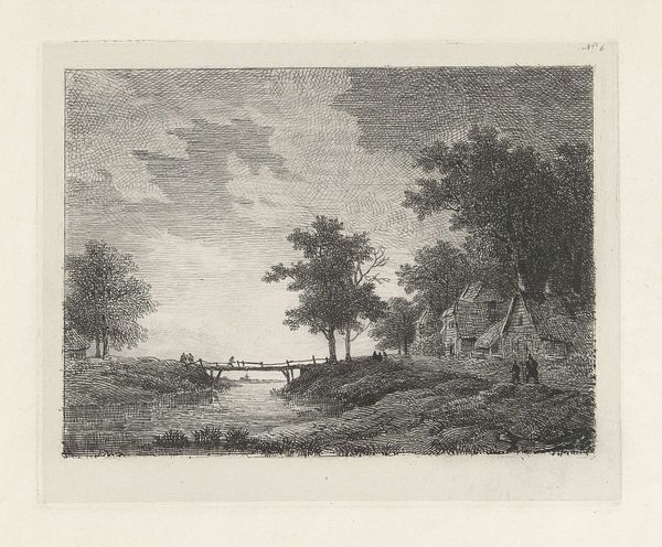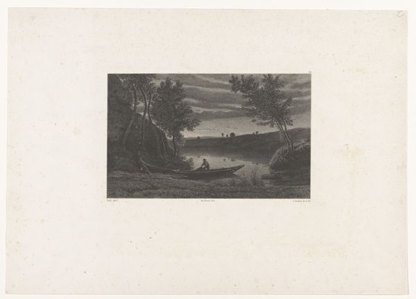 Curator: Henricus Wilhelmus Couwenberg created this engraving, "Gezicht op de Hunneschans bij Doorwerth met in de verte de Eusebiuskerk te Arnhem," around 1838. Editor: It evokes a deep sense of solitude. The muted tones create a somber, almost dreamlike atmosphere, while the silvery moonlight casts elongated shadows that enhance the overall feeling of melancholy. Curator: The choice of landscape and the time aligns perfectly with the rise of Romanticism in the Netherlands. It speaks volumes about Dutch national identity at this time and its fascination with historical locations and symbolism after French occupation. The couple shown almost blends in as an additional layer in this idyllic national vista, don't you think? Editor: Agreed, the human figures are rather small against the dominating scale of nature and history. Their positioning almost seems to provide depth to the work, acting as a bridge for our eyes from the detailed foreground into the expanse. The moon sits high up, yet the use of lighting and shade creates distinct foreground and background compositions. Curator: Couwenberg strategically positions us on the Hunneschans, which allows viewers a privileged viewpoint—literally standing on the past looking toward the present and the promise of Arnhem’s future as the distant Eusebiuskerk looms far in the background. Editor: It’s fascinating how Couwenberg masterfully balances intricate details like foliage textures and clothing against the vastness of the landscape. Look at how different and well defined the treatment of the moon is with its cloud backdrop, each precisely defined to give a balanced light throughout the work. Curator: That speaks to Romanticism and its emphasis on the sublime. Even in engraving, we feel that power of nature over human endeavor. Think of how that resonated then: feelings about nationalism, historical reflection and resilience of the Dutch identity would permeate any contemporary audience! Editor: For me, what resonates is that delicate interplay of textures and composition that evokes a sense of quiet contemplation. The visual narrative allows space for the viewer to just dwell within its gradations of gray and silver and create their own interpretations. Curator: And hopefully, with some historical context, be aware of that broader story as well. Editor: Precisely; It’s a beautifully structured and thoughtful creation.