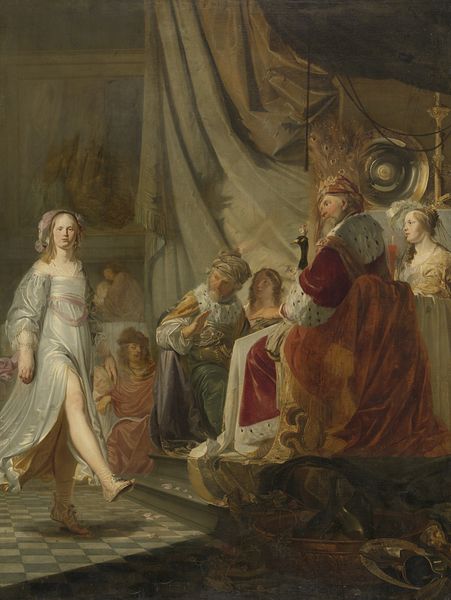 Curator: Standing before us is Stefano Pozzi’s "Antiochus Yearning for Stratonice," a painting from about 1740, which can be found here at The Art Institute of Chicago. Editor: The entire scene is cast in this theatrical light; it's all flowing robes and rather exaggerated gestures that lend an airy mood despite the underlying drama. Curator: Pozzi chose to depict a rather intriguing story, popular in art of the 18th century. We see Antiochus, son of King Seleucus, sick with a mysterious illness which is, of course, unrequited love for his stepmother, Stratonice. The painting dramatizes a key moment of revelation within a very public, even politically charged arena. Editor: The way Pozzi uses color to isolate the figures of Antiochus, Stratonice, and Seleucus creates such a strong visual dynamic. The muted palette heightens the tension. Antiochus appears almost luminous against the darker tones of his bedchamber. Curator: Yes, notice how Seleucus, seemingly consumed by the weight of the revelation, dominates the foreground? It’s a brilliant staging of power, vulnerability, and even marital bonds during a period hungry for displays of moral guidance. The fact that this episode from Plutarch’s "Lives" got repeatedly visually restaged really speaks to anxieties circling themes of familial duty and private passions. Editor: It's hard to ignore how the composition directs our eye across the painting. It moves from the son on his sickbed, towards Stratonice whose downcast gaze contrasts sharply with Seleucus who's grappling with the implications, as figures look on, trapped in the ripples of consequence and betrayal. Curator: The painting's impact then extends beyond pure aesthetic experience. Its display encourages reflection on the moral codes embedded within royal representation and the very function of didactic historical painting during the enlightenment. It is the perfect enactment of love and politics. Editor: Pozzi captured the characters, not only through gesture, but their very relationship to space. You're right; the choice of staging adds volumes to the way this scene is understood. Curator: Indeed, this exploration invites a dialogue on the public and private domains of life, doesn’t it? Editor: Absolutely. And it highlights just how much we can unpack when we combine art and social context.